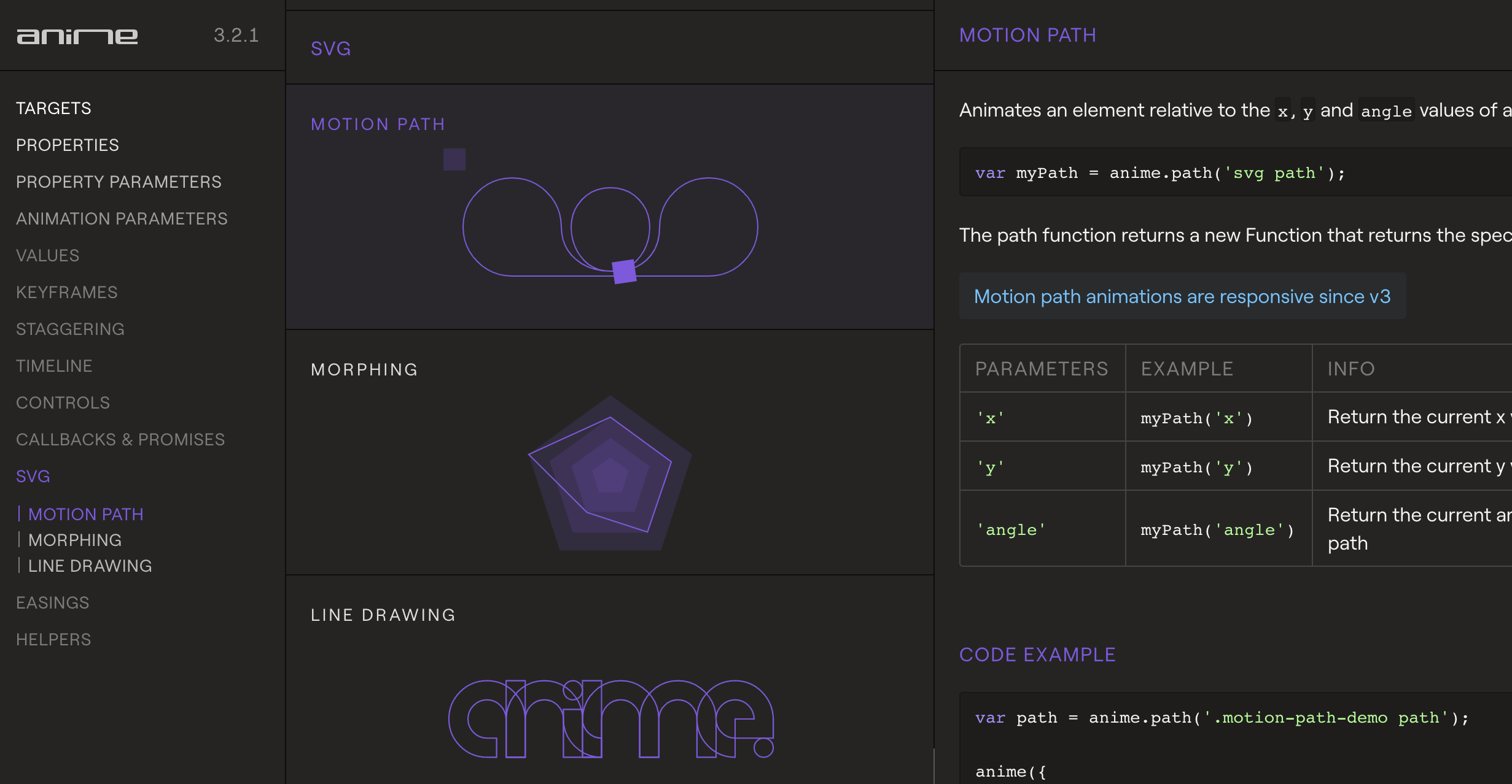 可快速地通过编程制作动画,包括而不限于 SVG、CSS、Keyframes 等。在前几期前端开发者周刊中,也曾介绍过另外一个动画引擎: GSAP。