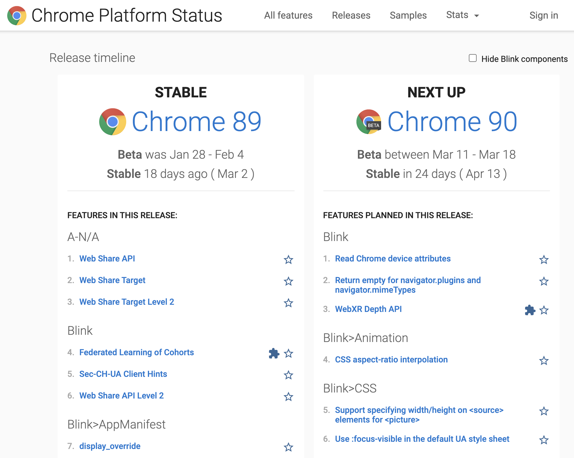 四、 Chrome Platform Status: Chrome 发布版本新特性大览